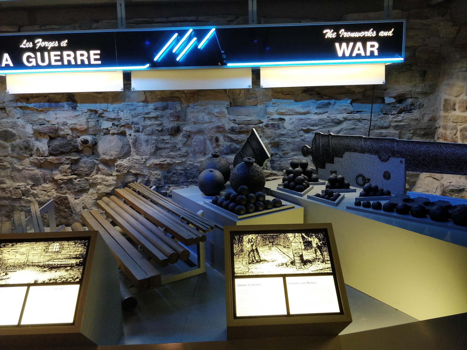It’s time to say goodbye to Montreal and start heading for Quebec City. We don’t want to arrive there till Friday night, so we decide to stop at Trois Rivieres for the night at a Tourist Information Center. We take the scenic Chemin de Roy which is the first road built in North America (1731-1737). Our first stop is Forges du Saint Maurice, the first ironworks company in Canada. It was established in Canada in 1730 as an industrial village with the sole purpose of producing pig iron to export back to France. The 500 inhabitants of the village consisted of a few skilled ironworkers for the forge and a lot of support staff and their families. One of the most important and very labor intensive tasks was the production of charcoal. This required harvesting wood, (a worker was expected to produce 10,000 cords a year!!), cut it to a precise length, stack it in a precise way, cover it with leaves and dirt, then slowly let it burn for 6 weeks while monitoring and preventing it from catching fire. For the 150 years this company stayed in business, besides producing pig iron, they also produced pots, iron tools, eating utensils, cannons and cannonballs. What they were most known for was making wood burning kitchen stoves. The company finally shut down due to a lack of skilled workers.