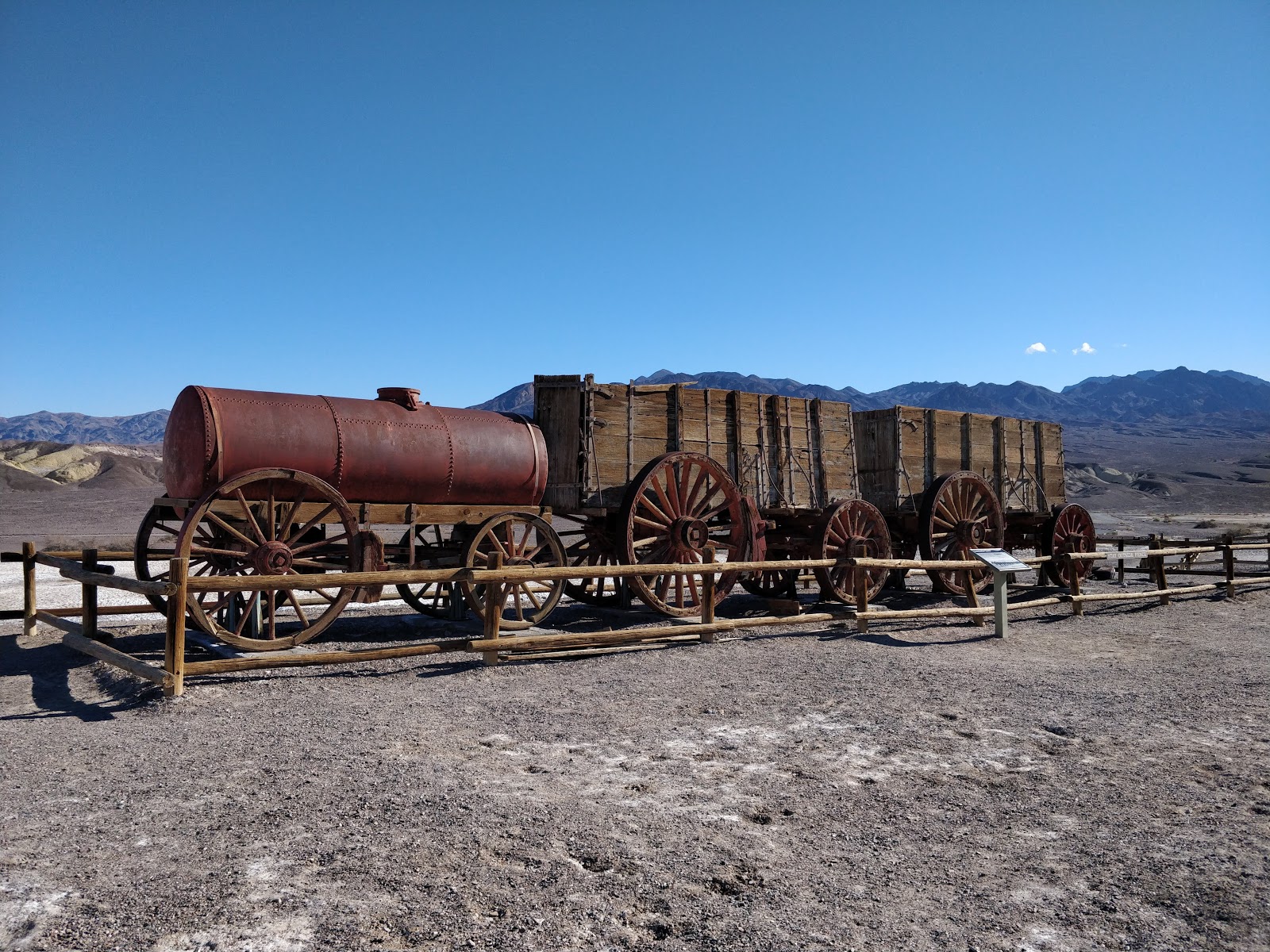The mountains and canyons are colored by mineral deposits and volcanic activity.  Borax was mined here in the 1880s.  Wagon trains of 20 mules pulled the 36-ton loads at a speed of 2 miles per hour to the railroad.  Each round trip took 30 days.  The borax was known as the “white gold of the desert” as it was basically the only profitable mining in Death Valley due to the extreme conditions.
