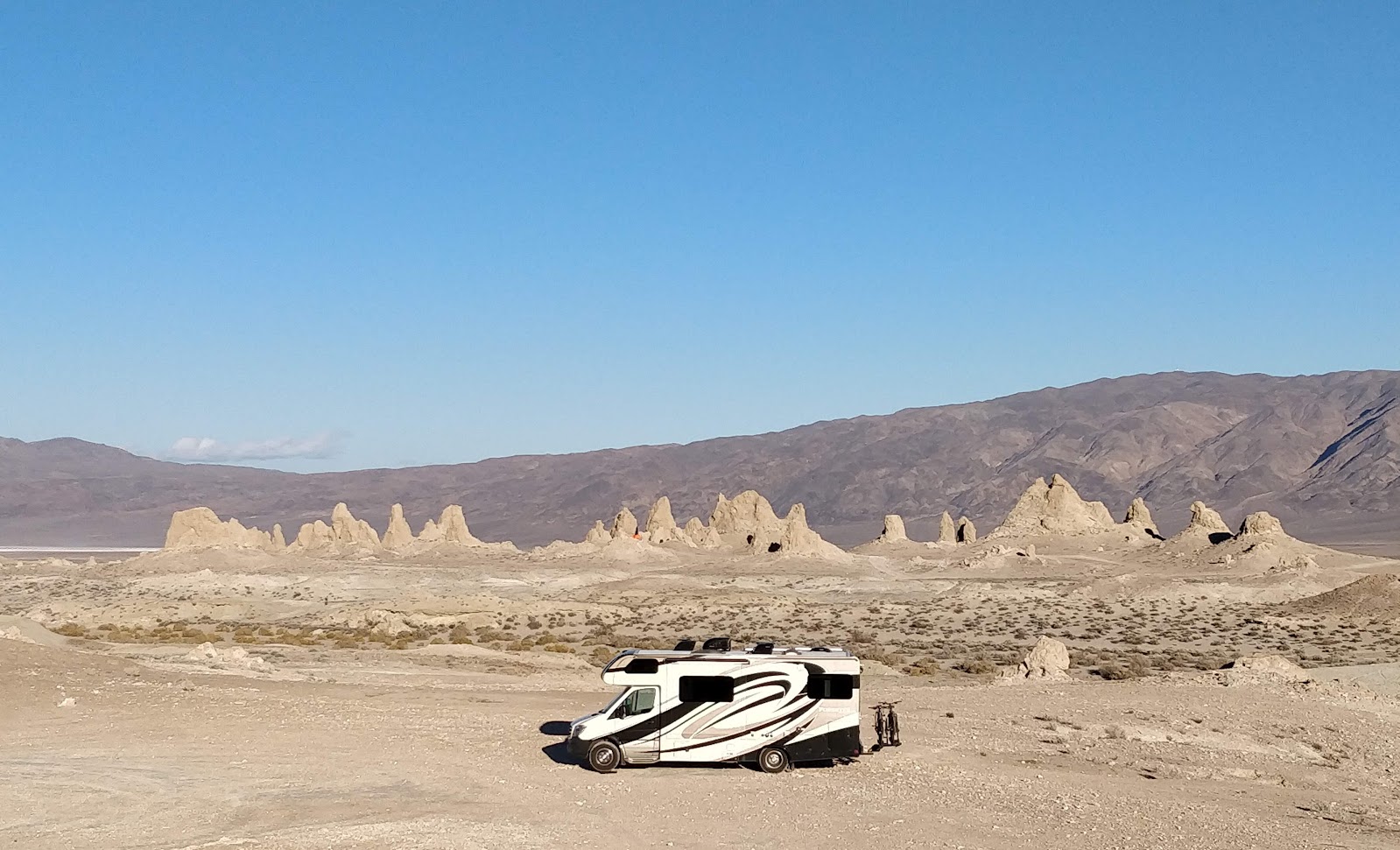 We brave the winds and head north through solar fields and windmill fields.  The rains have mostly dried up, the sun is out, but the winds are fierce.  We find our way to the Trona Pinnacles National Natural Landmark.  The pinnacles look like nothing we have ever seen.  They are 10-100 thousand years old and consist of calcium carbonate formed in an underground sea so long ago.  They are slowly wearing away into this desolate landscape.  Lots of day use ATVs and off-road vehicle traffic, but only a few campers.