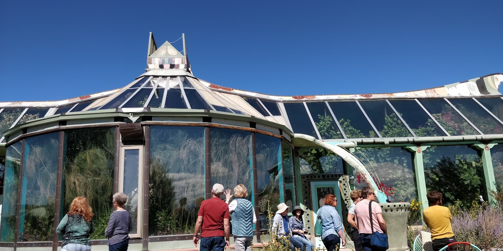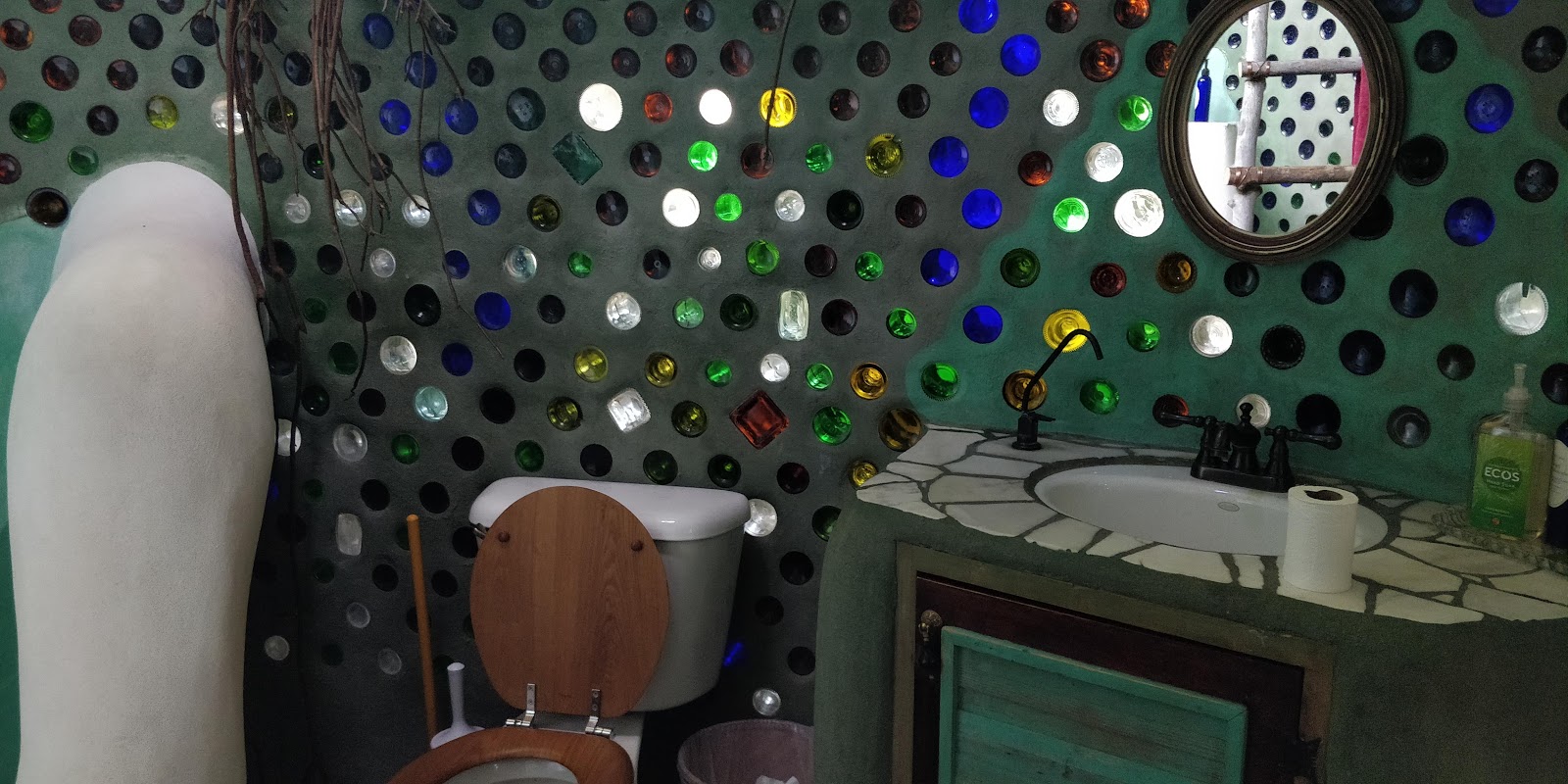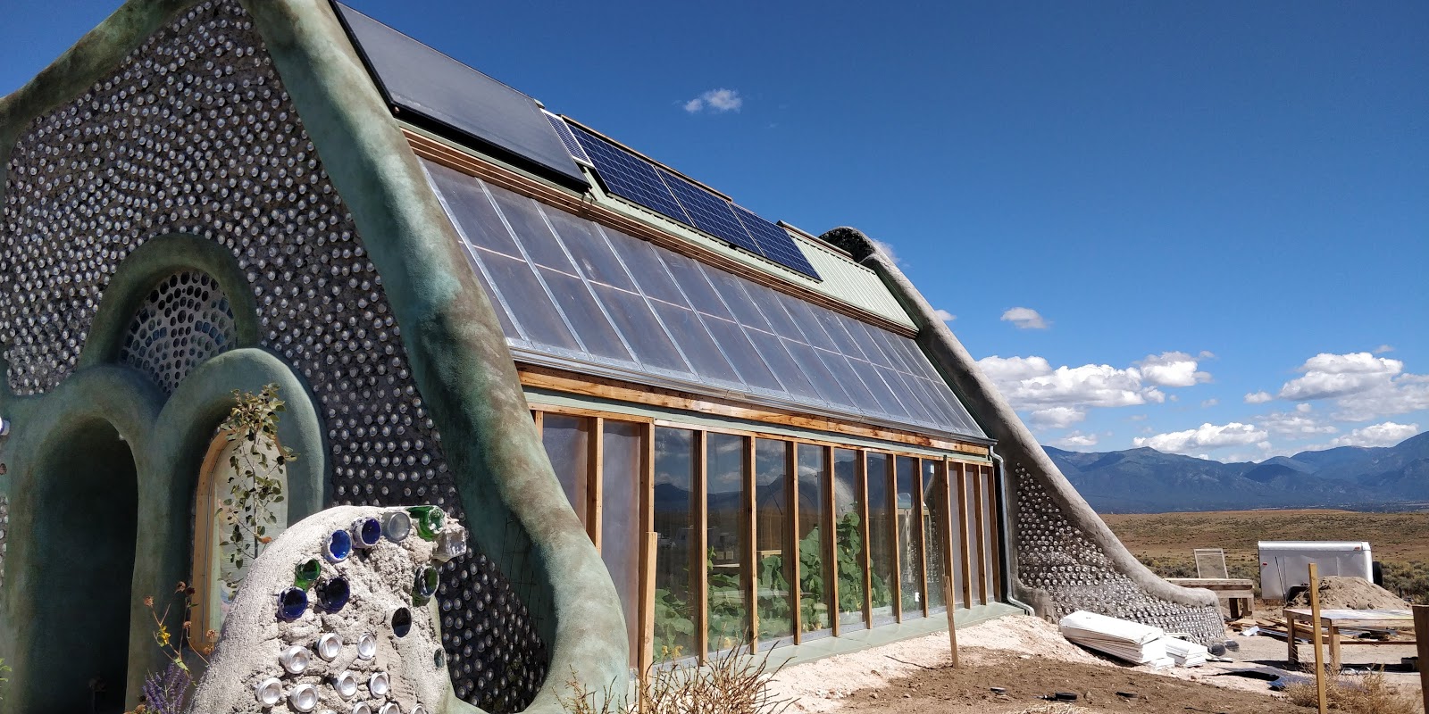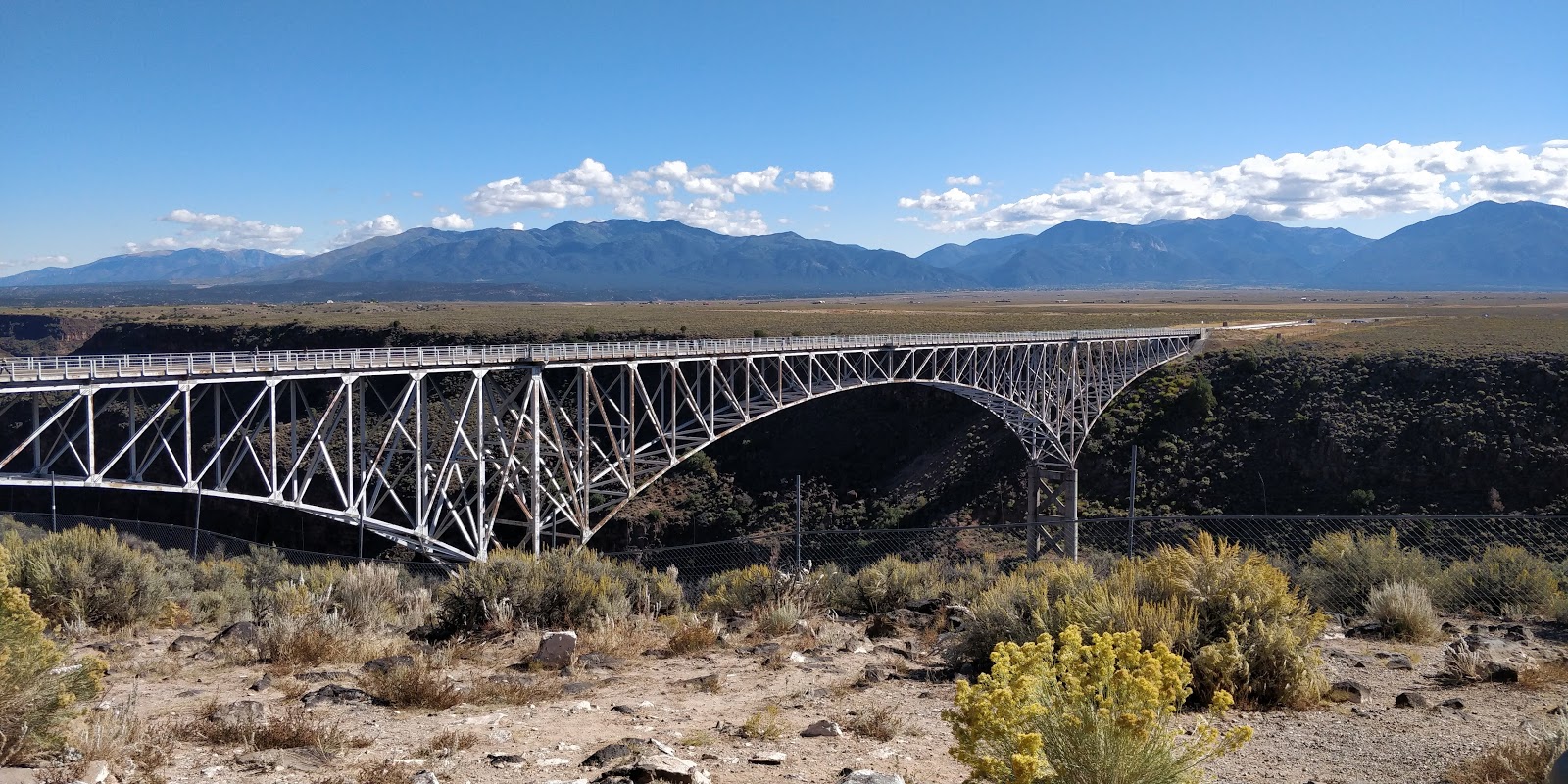 28 Sept 2019 – Taos is our next stop.  Unfortunately the Taos Pueblo is closed due to an upcoming feast.  Rio Grande Gorge Bridge nearby has fantastic views into the deep gorge.  There are even crisis phones in case one is thinking of jumping! We enjoy a wonderful tour of the Earthships in Taos – self-sustaining homes that provide food, energy, clean food, shelter, and waste management.  The structures are very funky, often built with three sides into earth hillsides.  Walls are constructed of up to 500 tires with rammed earth in them, glass and plastic bottles embedded into exterior walls to provide light, and tin cans laid on the side to form bricks in concrete. Homes range from tiny to vast.  We tour two rental properties which were very fancy and beautiful. The tour lasted about 2 hours and only cost us $12 for the two of us.  Well worth the time and money!  We stop at the Santuario de Chimayo shrine, a pilgrimage site where people stop to collect holy dirt said to be curative.