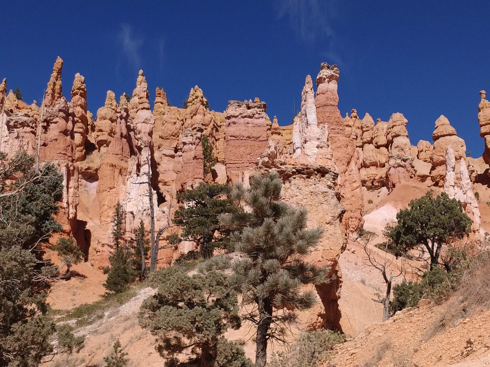 14 Oct 2019 – Into Utah, we visit Bryce Canyon. What an incredible vista! We like it better than Zion. The best area is a natural bowl-shaped amphitheater filled with numerous spires and hoodoos of all shapes, sizes, and incredible colors. We hike the Navajo Loop trail and the Queens Garden Trail. The Queens Garden was far superior, taking us down a steep trail into the canyon bottom. Great views also at Bryce Point and Inspiration Point. Fantastic hiking warm and sunny weather makes for a fantastic day.