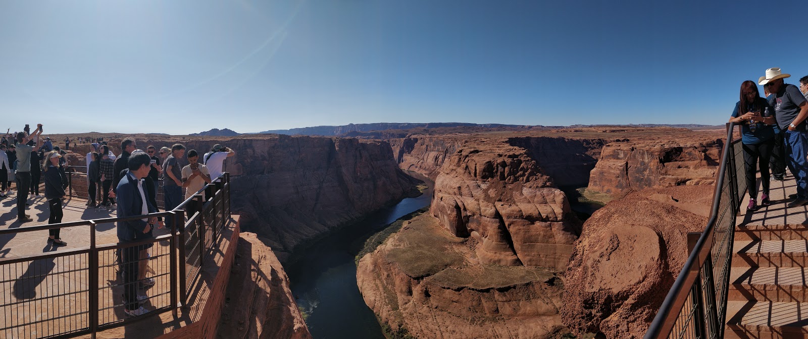 1-12 Oct 2019 – We go on a tour of Secret Slot Canyon with Horseshoe Bend Slot Canyon Tours in the Page AZ area. A wondrous experience, we tour with only 12 people so get great photos. Our guide helps the ambiance by playing his flute in the canyon. This magical canyon is one of the most beautiful sights we have ever seen – so many shades of orange, yellow, red, with curves and waves carved into the sandstone over the years by water and wind. We stop at Horseshoe Bend to see the green Colorado River carve its way through the sandstone – also very picturesque.